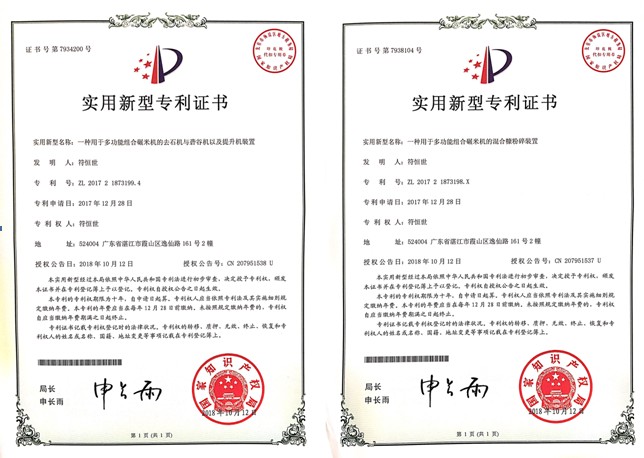 值得一提的是湛江市金順糧食機械制造有限公司通過iSo9001體系已獲得多個專利,其中有外觀專利(多功能碾米機);實用專利(一種多功能組合碾米機、一種用于多功能組合碾米機的去石機與礱谷機以及提升機裝置、一種用于多功能組合碾米機的混合糠粉碎裝置、一種用于多功能組合碾米機的電控與風(fēng)機裝置、一種用于多功能組合碾米機的比重篩和碾米機裝置);發(fā)明專利(湛江碾米機、符氏ZJF-15-40M&S型號組合碾米機)等。