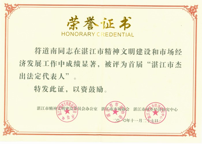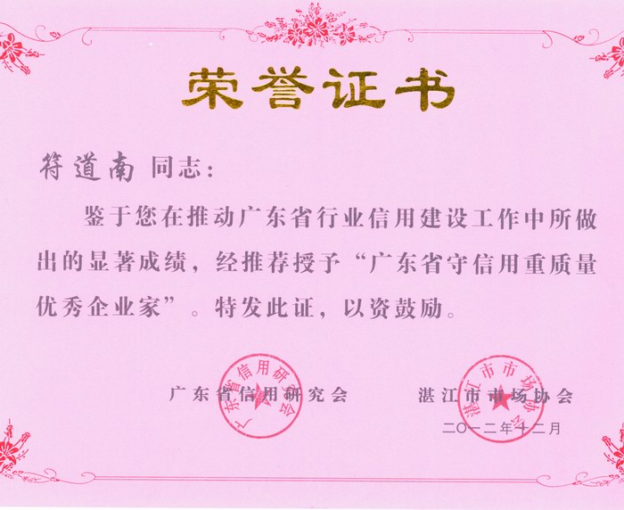 2011年度湛江市優(yōu)秀企業(yè)家榮譽證書2012年3月